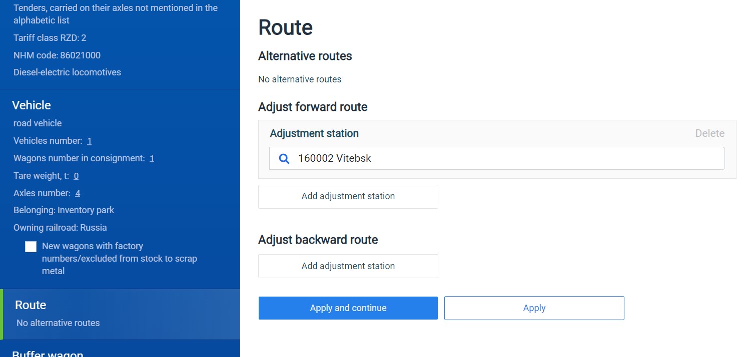 To manually adjust a route in the “Adjust forward route” or in the “Adjust backward route” sections, click the “Add adjustment station” button and type in the station code or name. In the case of export hauls, a proper exports station must be specified and will be matched with a corresponding border crossing station.