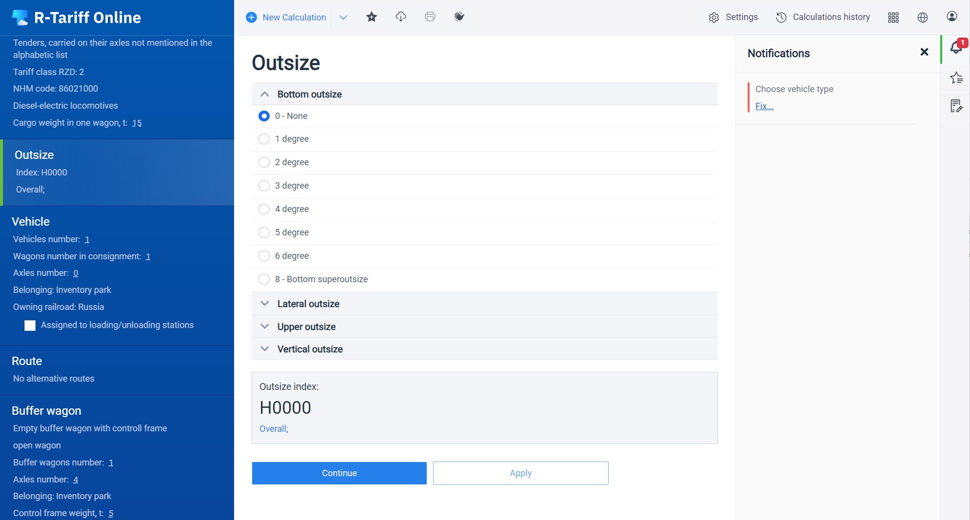 To calculate such a haul, select a “Wagon consignment” — “On chains of platforms, transporters, outsize cargo” set of options. The initial data tree will now have the “Outsize” section.