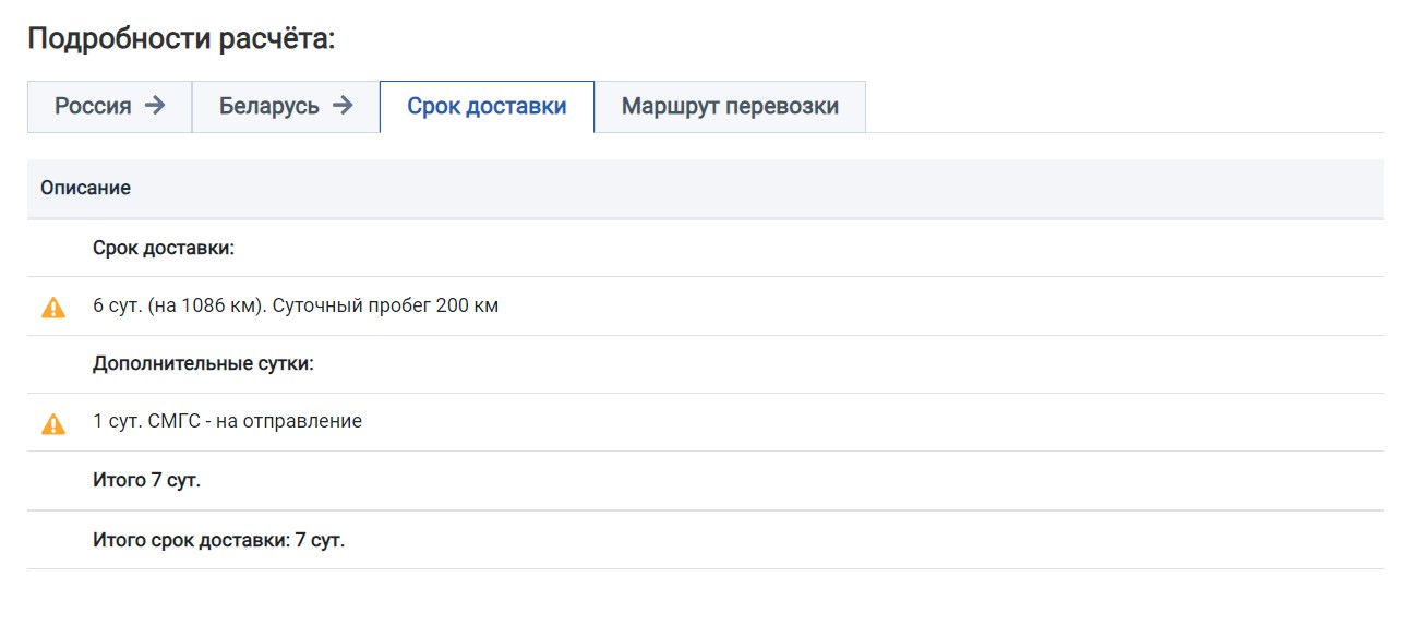 Подробности расчёта срока доставки вынесены в отдельную вкладку «Срок доставки» под итоговой таблицей. На этой вкладке срок доставки будет рассчитан одновременно для гружёного и для порожнего рейса , если в расчёте подключен возврат порожнего вагона/контейнера. В подробностях выводятся общее расстояние перевозки, суточный пробег и срок доставки, исчисленный исходя из норм суточного пробега. Ниже отображаются дополнительные сутки, на которые увеличивается срок доставки в зависимости от производимых операций или перевозимого груза. Последней строкой суммируется срок доставки гружёного и порожнего рейсов. На вкладке подробностей расчёта по конкретной стране указывается срок доставки за общее расстояние в прямом или обратном направлении.